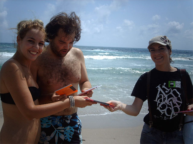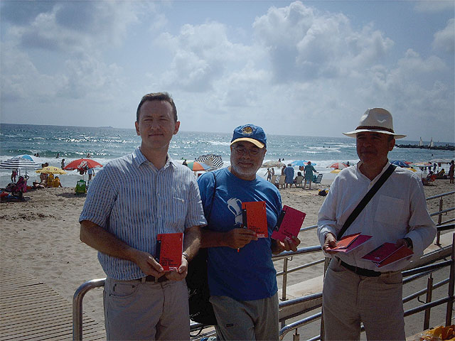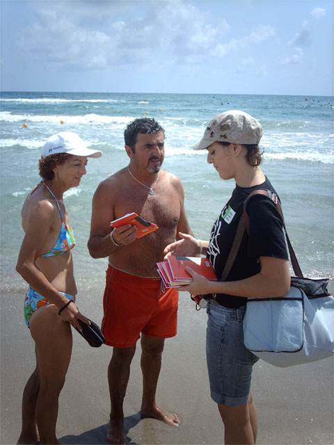El Director General del Libro, Archivos y Bibliotecas, Francisco Giménez Gracia, y el director de Ediciones Tres Fronteras, José Antonio Bascuñana, acompañaron a las azafatas que repartían libros a pie de playa. Los títulos de la colección de pequeño formato Microfronteras fueron recibidos con entusiasmo por los veraneantes del Mar Menor.