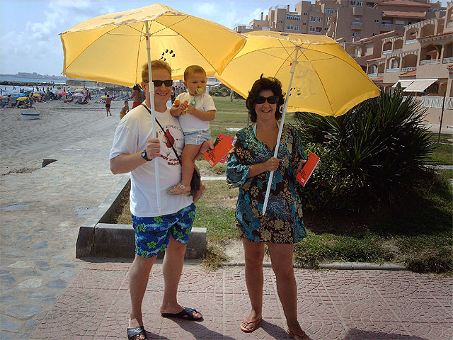 Esta mañana se han repartido 5.000 libros gratuitos en la playa Galúa de La Manga junto a 500 sombrillas promocionales ideales para leer bajo el sol.