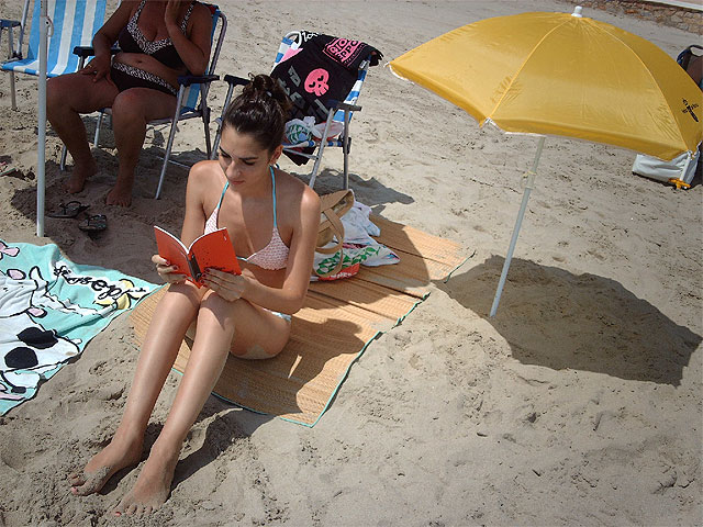 A mediodía, la playa murciana aparecía inundada de sombrillas amarillas de la Dirección General del Libro, Archivos y Bibliotecas y de libros de Ediciones Tres Fronteras, todo un nuevo éxito por el fomento de la lectura.