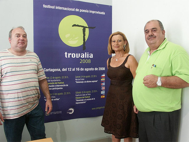 La concejala de Festejos, Florentina García Vargas, y el presidente de la Asociación Trovera 'José María Marín', Joaquín Sánchez, han presentado esta mañana el Festival Internacional de Poesía Improvisada Trovalia 2008, que se desarrollará del 12 al 16 de agosto en cuatro escenarios distintos: Cartagena, Molino Derribao, Mar de Cristal y Cabo de Palos. Será en la Plaza del Ayuntamiento, en el polideportivo, en el paseo marítimo y en el puerto, respectivamente.