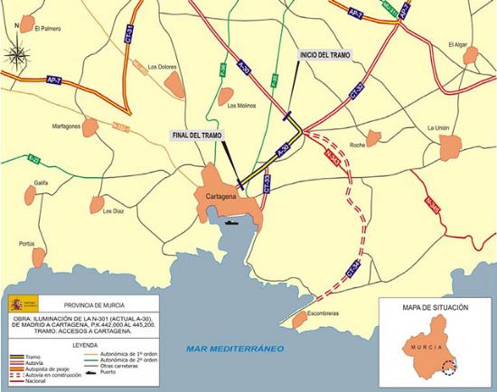 El pasado 2 de Agosto el Ministerio de Fomento comunicaba la licitación, con su publicación hoy en el Boletín Oficial del Estado,  de las obras de iluminación del tramo de acceso a Cartagena, en la N-301, de Madrid a Cartagena, actual A-30. El presupuesto de licitación asciende a 800.573 euros.