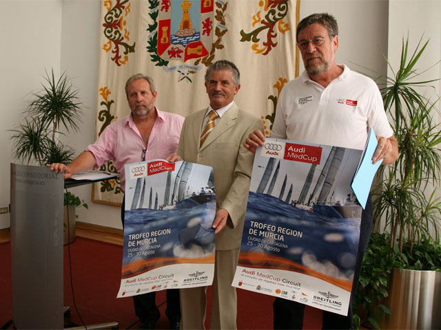 El concejal de Deportes del Ayuntamiento de Cartagena, Alonso Gómez López, acompañado por el director técnico del Patronato Municipal de Deportes, Eduardo Armada, y el coordinador general de la MedCup, Francisco Muñoz, ha presentado hoy un amplio abanico de actividades deportivas complementarias que se desarrollarán en el puerto del 26 al 30 de agosto, coincidiendo con la celebración del Trofeo Región de Murcia, quinta etapa del circuito Audi MedCup, en nuestra ciudad.