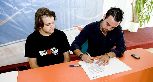 El presidente del Consejo de la Juventud, Manuel Soler, junto al de la asociación Música Viva, Javier Espinazo, entidad colaboradora, han firmado esta mañana el convenio para llevar a cabo este servicio. Este acuerdo amplía el número de acciones que en materia de promoción artística juvenil está realizando el Consejo de la Juventud de Cartagena, siendo más significativas en el terreno de la música, donde el Consejo ya cuenta con colaboraciones en festivales consagrados de promoción de grupos noveles como el Bud Coyote, así como el posicionamiento contra el canon digital en defensa de los derechos de los jóvenes artistas, tal y como ha señalado Soler.