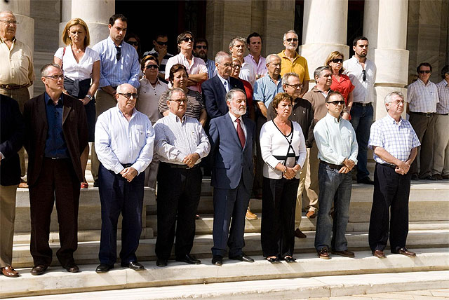 La Corporación municipal de Cartagena, funcionarios y ciudadanos, se han concentrado este mediodía a las puertas del Palacio Consistorial, en señal de repulsa por los últimos atentados de la banda terrorista ETA y en especial por el perpetrado esta pasada madrugada, en Santoña, que ha costado la vida del brigada del Ejército, Luis Conde de la Cruz.