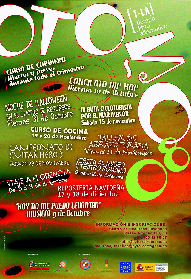 En cuanto al T-LA de otoño, cuenta con un presupuesto de 15.000 euros destinado a 60 actividades entre las que destacan un taller de Capoeira y Bailes Latinos, Noche de Halloween en el Centro de Recursos y Pedanías, curso de cocina divertida y repostería navideña, el musical 'Hoy no me puedo levantar' en Madrid y el espectáculo 'Varekai' del Circo del Sol también en Madrid. Además se incluirán visitas turísticas al Teatro Romano y rutas por el Casco Histórico de la ciudad, así como la III Ruta cicloturista por el Mar Menor.