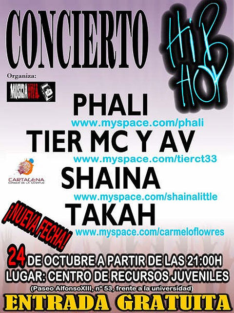 El próximo viernes 24 de octubre, a las 21,00 horas, tendrá lugar en el Centro de Recursos Juveniles un concierto de hip-hop, donde todos los amantes de esta música podrán disfrutar de las letras, rimas y versos que forman parte de nuestra vida. Los grupos participantes serán Phali, Tier MC y AV, Shaina y Takah.