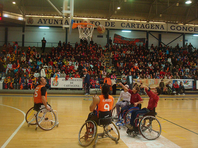 El Pabellón Central de Deportes celebró ayer una actividad especial dentro del programa ADE (Acercamiento al Deporte de Élite) organizado por la Concejalía de Deportes del Ayuntamiento de Cartagena. Unos 800 alumnos de primaria de nueve centros escolares de la comarca de Cartagena que vivieron una intensa jornada junto al Peinsa B.S.R. (Baloncesto en Silla de Ruedas) La Unión, equipo de máxima categoría nacional.