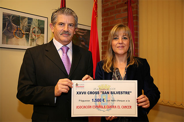 Alonso Gómez López, concejal de Deportes del Ayuntamiento de Cartagena, ha hecho entrega esta mañana a María Rosa Rosique, presidenta de la Junta Local de la Asociación Española Contra el Cáncer, de un cheque por importe de mil quinientos euros como parte de la recaudación de las inscripciones de la pasada 'San Silvestre'.