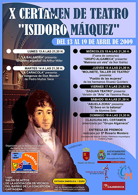 La puesta en escena de la obra de teatro 'Arte', de la compañía Zaguán Teatro, fue la ganadora al mejor montaje del X Certamen de Teatro 'Isidoro Máiquez' organizado por la asociación cultural del Barrio de la Concepción, en colaboración con la concejalía de la Mujer y el Instituto de la Mujer de la Región de Murcia y que se desarrolló del 13 al 19 de abril.