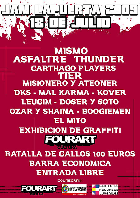 La Concejalía de Juventud, a través del programa T-LA (Tiempo Libre Alternativo) y en colaboración con el Grupo Joven Lapuerta, ha organizado un concierto que, bajo el nombre 'Jam Lapuerta 2009', reunirá la noche del sábado 18 de julio a varios grupos cartageneros especializados en el arte del hip hop, graffiti, breakdance, etc.