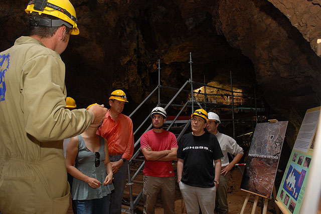 El periodista Fernando Sánchez Dragó ha visitado esta mañana la Cueva Victoria, acompañado por el concejal de Turismo, Javier Herrero, y por el equipo que trabaja a diario en este yacimiento paleontológico situado en el Estrecho de San Ginés.