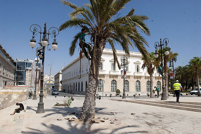 La Delegación de Parques y Jardines de la concejalía de Infraestructuras está llevando a cabo la poda de hojas secas de más de 397 ejemplares de palmeras situadas en la zona del Puerto de Cartagena y distribuidas por la Cuesta del batel, Paseo Alfonso XII, Muralla del Mar y en la Plaza de Héroes de Cavite.