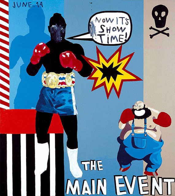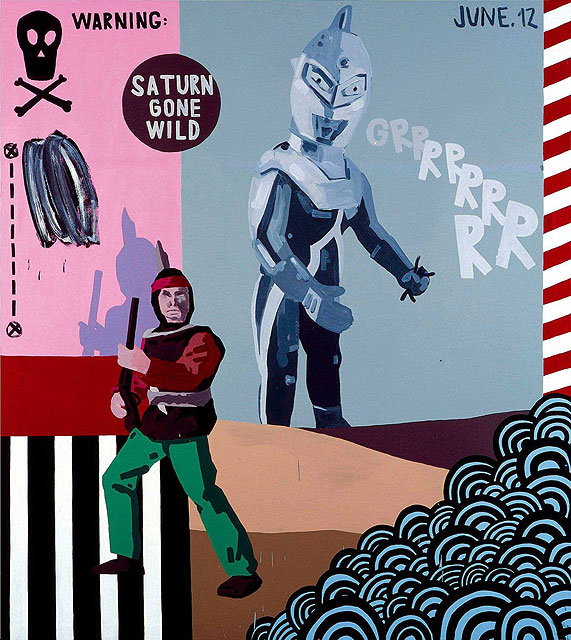 La muestra, sobre la violencia contemporánea, se caracteriza por el uso de iconos del comic y de la cultura popular, plasmados en una pintura de derivas pop