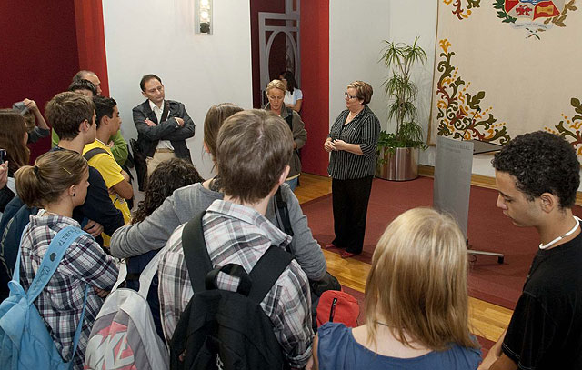 Alumnos del IES Salvador Sandoval de Las Torres de Cotillas y el Zweites Gymnasium de Rottenburg (Alemania) han sido recibidos esta mañana en el Palacio Consistorial de Cartagena por la concejala de Educación, Josefa Maroto. Los estudiantes han realizado previamente una vista cultural por los diferentes centros de interpretación de la ciudad. En el Palacio Consistorial la concejala les ha dado la bienvenida y les ha explicado algunos aspectos importantes de este histórico edificio.