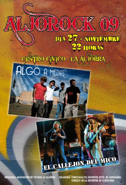 El viernes, 27 de noviembre, a las 22:00h, tendrá lugar en el Centro Cívico de La Aljorra, la III Edición del 'Aljorock', organizado por la Asociación de Vecinos, contando con la colaboración de la Concejalía de Juventud y el Consejo de la Juventud de Cartagena. Este año los grupos son el Callejón del Mico y Algo a Medias.