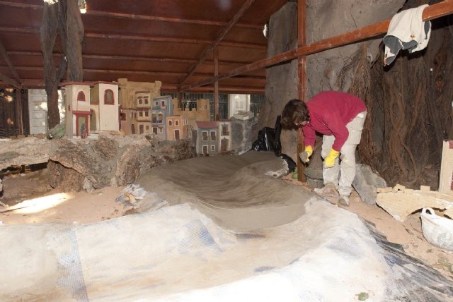 El Belén lo conforman más de 300 figuras de Nicolás Almansa y Juan Antonio Griñán, y mantiene la techumbre de 300 metros cuadrados de tablero marino que lo protegerá de posibles lluvias, así como de la caída de las bolas que generan los árboles de la plaza.