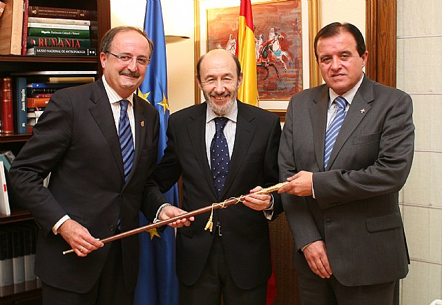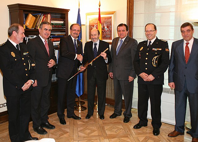 Una representación de la cofradía Nuestro Padre Jesús Resucitado, de Cartagena, encabezada por Tomás Martínez Pagán, ha hecho entrega esta tarde al ministro del Interior, Alfredo Pérez Rubalcaba, de un bastón de mando, réplica de uno del siglo XIX que se conserva en la Escuela de Policía de Ávila.