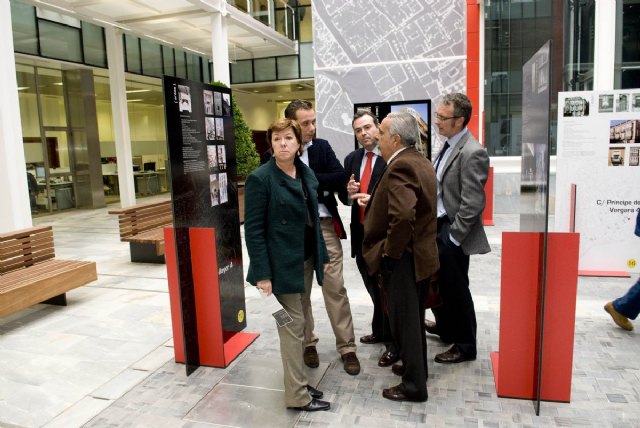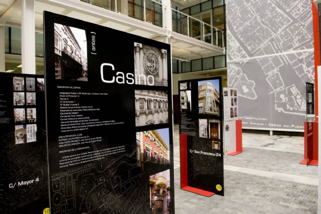 El patio central del nuevo Edificio Administrativo de San Miguel acoge una exposición del programa de recuperación y rehabilitación de fachadas en el Centro Histórico de la Ciudad, que a lo largo de los últimos 13 años, ha llevado a cabo la Comunidad Autónoma y el Ayuntamiento de Cartagena, a través de la sociedad Casco Antiguo.