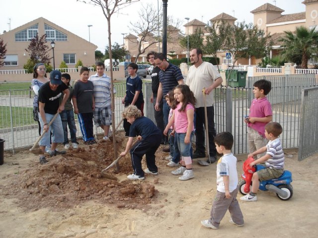 Los jóvenes de la diputación de El Albujón, llevaron a cabo e viernes la replantación de una treintena de ejemplares entremoreras, gravilleas, ficus nitida, taray, hibiscus y jacarandasen los jardines de la Plaza de la Juventud, entre las calles Sierra del Tigre y Sierra Madre.