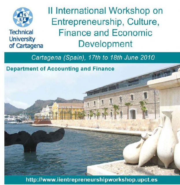 El II Internacional Workshop on Entrepreneurship, Culture, Finance and Economic Development es la segunda edición de un evento que permite una colaboración dinámica entre universidades europeas, americanas y españolas, está organizado por la Cátedra Bancaja Jóvenes Emprendedores de la UPCT en colaboración con la Facultad Ciencias de la empresa de la misma universidad, la Fundación Séneca y organismos tanto locales como regionales como son la ADLE, el INFO y la propia Consejería de Universidades, Empresa e Investigación.