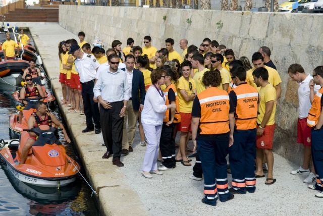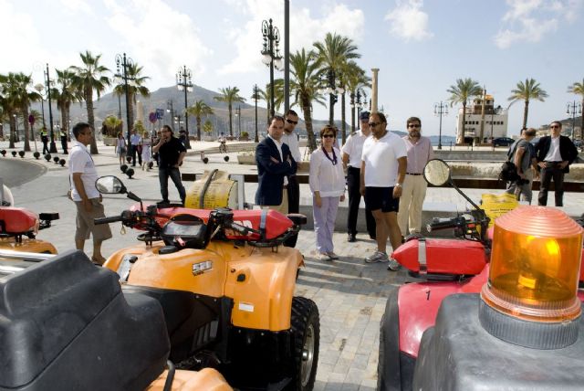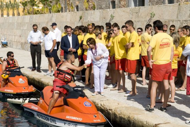 La alcaldesa, Pilar Barreiro, ha presentado esta mañana en la explanada de los Héroes de Cavite los nuevos medios humanos y técnicos con los que contará Protección Civil este verano para llevar a la práctica el Plan de Vigilancia y Seguridad en las playas del litoral cartagenero. En el acto de presentación han estado el director de Seguridad, Carlos Nieto, el concejal de Seguridad Ciudadana, Javier Herrero, y el director del Instituto Municipal de Servicios del Litoral, Gabriel Ruiz.