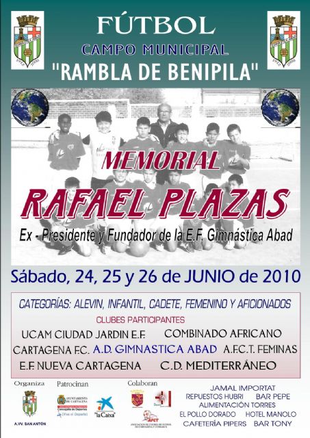 Por otro lado, la E.F. Gimnástica Abad organiza a partir del jueves 24 de junio en el campo municipal Rambla de Benipila, el Memorial Rafael Plazas, expresidente y fundador del club, personaje histórico del populoso barrio de San Antón, que abanderó durante muchos años las labores directivas de la entidad. Los emparejamientos de equipos y categorías participantes serán los siguientes: