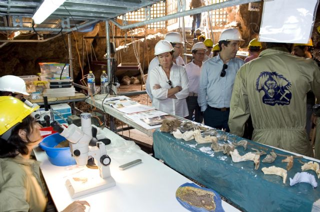 La alcaldesa de Cartagena, Pilar Barreiro, y el consejero de Cultura, Pedro Alberto Cruz, han visitado esta mañana la Cueva Victoria para conocer el desarrollo de la nueva campaña de excavaciones dirigida por los investigadores Luis Gibert y Carlos Ferrández.