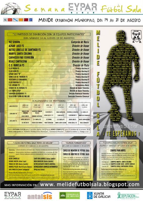 Los pupilos de Fonseca emprenderán su camino hacia tierras gallegas, más concretamente a Melide y Foz, para participar en la Semana Eypar de Fútbol Sala donde disputarán los siguientes encuentros: