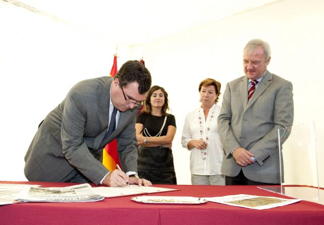 El presidente de la Comunidad, Ramón Luis Valcárcel, acompañado de la alcaldesa, Pilar Barreriro, el consejero de Obras Públicas, José Ballesta, y la alcaldesa de Fuente Álamo, María Antonia Conesa, ha colocado la primera piedra que marca el inicio de las obras de la mejora de la carrtera RM-332 que une Cartagena con Mazarrón, por la que circulan anualmente unos dos millones de vehículos.