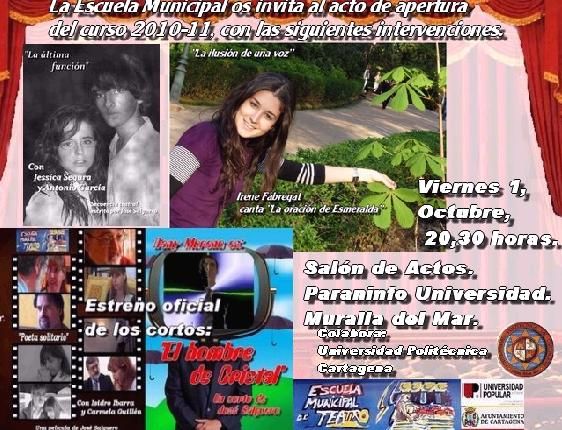 La Escuela Municipal de Teatro celebra el viernes 1 de octubre el acto de apertura del curso 2010-2011 y lo hará, como viene siendo habitual cada año, con un resumen videográfico de todas las actividades realizadas durante el curso pasado, además de actuaciones musicales y secuencias teatrales.