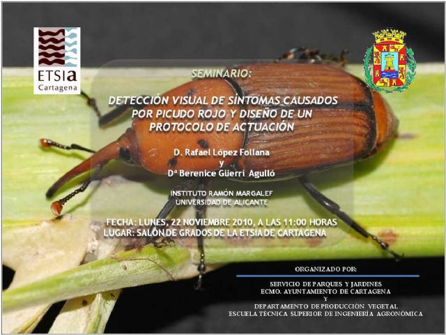 Dadas las continuas consultas ciudadanas que sobre la plaga del picudo rojo se vienen recibiendo en el Ayuntamiento de Cartagena, el Servicio Municipal de Parques y Jardines ha organizado una charla divulgativa en la que investigadores del Instituto Ramón Margalef de la Universidad de Alicante orientarán sobre detección visual de los síntomas y el protocolo de actuación frente a esta plaga que está afectando a las palmeras de todo el Mediterráneo.