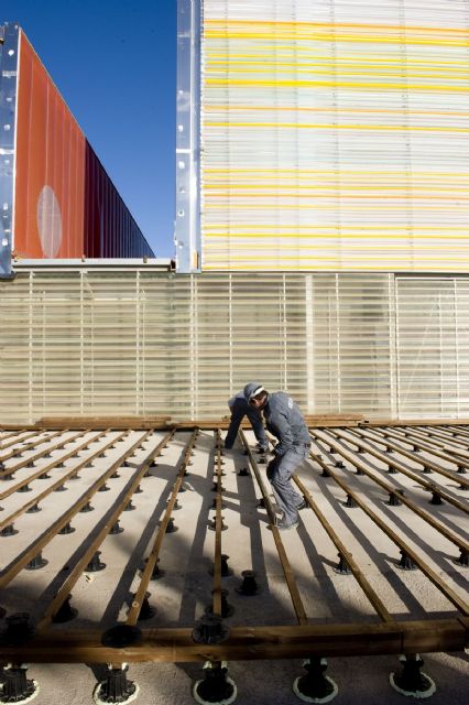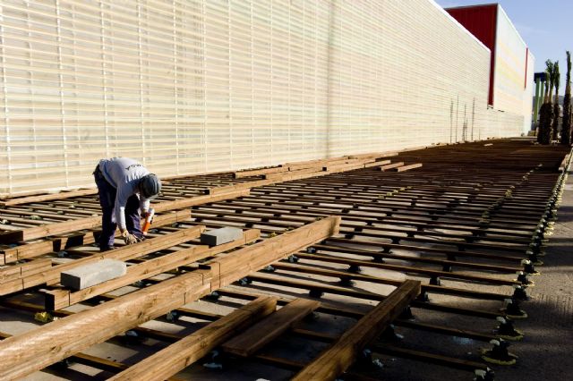 Las obras de adecuación del exterior del Auditorio y Palacio de Congresos de Cartagena encaran su recta final en estos días con la instalación del entarimado de madera en los cerca de 20.000 metros cuadrados de superficie que circundan el edificio. Se trata de tablones de abeto cuperizado, preparados para soportar la humedad y los hongos, y que han sido utilizados con éxito en otras zonas esparcimiento marítimo como el puerto de Barcelona.