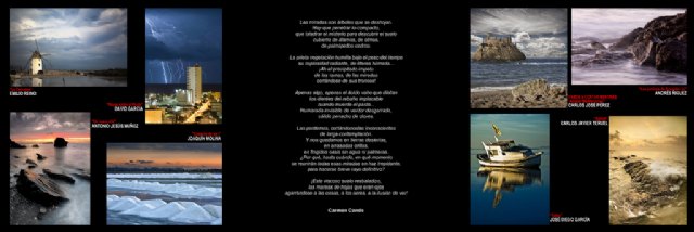 Miradas de Mariano Belmar con sus impresionantes y únicas escenas de playa como también las de Carlos Javier Teruel. Miradas oníricas a los “Jardines de Poseidón” de Andrés Ñiguez. José Luis Balsalobre se adentra en las miradas de los niños para preguntarse qué es lo que piensan. Miradas de Emilio Reino de Calblanque, La Calcetera y Fatares. Antonio Jesús Muñoz mira desde “Un nuevo día” hasta “Muerte en el mar”.José Carlos Ñiguez nos muestra su mirada entre brumas, gritos, lluvia e infinitos. Bandera rota, Tatim y molienda son las miradas de José Diego García. Instantes urbanos bajo la lluvia son las miradas que nos brindaJulián Contreras. Atalayón, rayos y sueños rotos es a donde dirige su mirada David García. El origen de la sal es la mirada de Joaquín Molina. Y por último las miradas muy particulares de Carlos José Pérez contándonos mentiras.