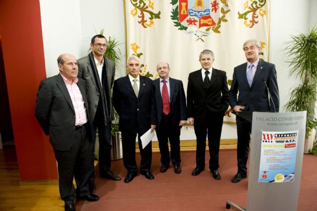 El concejal de Deportes, Alonso Gómez, acompañado del director general de Deportes, Antonio Peñalver, el presidente de la Federación de Tenis de la Región de Murcia, Antonio García, han presentado esta mañana en el Palacio Consistorial la XXV edición de Circuito Internacional de Futures ATP, Gran Trofeo Cajamurcia de Tenis.