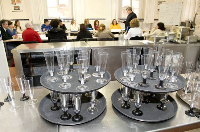 Actualmente, los futuros camareros están inmersos en el módulo sobre vino en el que aprenden los tipos de uva o las denominaciones de origen de España y de la Región. En la parte práctica realizarán una cata de vinos y una visita a las Bodegas Alceño para ver in situ el proceso de elaboración del vino, ha explicado David Acosta, profesor del curso.