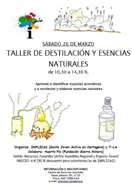 El programa Implica2 (Gente Joven Activa en Cartagena) del Espacio Joven de la Concejalía de Juventud ha organizado un Taller de destilación y elaboración de esencias naturales en colaboración con el Parque Ambiental de Huerto Pío de la Fundación Sierra Minera, actividad que se circunscribe dentro de la programación del T-LA (Tiempo Libre Alternativo) de invierno.