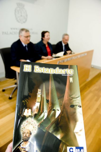 La concejala de Cultura, Rosario Montero, y el director de la emisora de radio COPE Cartagena, Francisco Mínguez, acompañados por el secretario general de la agrupación del San Pedro, José Blas Martínez, han presentado hoy un nuevo número de la revista que edita la citada emisora, El Estandarte, que este año dedica un monográfico a la figura de Pedro Marina Cartagena (San Pedro), así como un CD Músicos de Semana Santa en Cartagena.