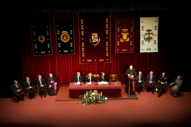 Ante un patio de butacas lleno y en presencia de entre otras autoridades, del presidente de la Asamblea, Francisco Celdrán, el delegado del Gobierno, Rafael González Tovar, el obispo de Cartagena, José Manuel Lorca Planes, el almirante jefe de Acción Marítima, Francisco Javier Franco Suanzes, la consejera de Sanidad, María Ángeles Palacios, y los cuatros hermanos mayores, Carlos Amigo ha disertado durante cerca de 60 minutos sobre los aspectos más destacados de la pasión de Cristo y el auténtico espíritu cristiano, salpicado con referencias a los desfiles pasionales de la ciudad y la singularidad de su orden, su luz y su armonía.