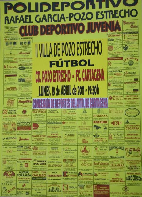 El lunes 18 de abril se disputará el encuentro que enfrentará al primer equipo de Cartagena con el C.D. Pozo Estrecho, que milita en la categoría de Preferente de la Liga Federada de la Región de Murcia