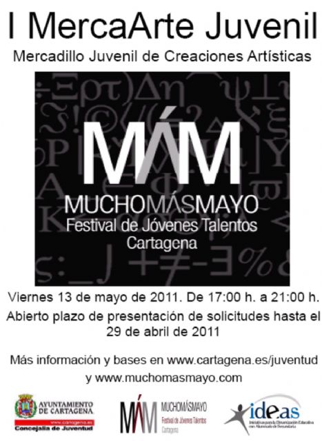 El Festival Mucho Más Mayo inaugura este año una nueva sección, el I MercaArte Juvenil, mercadillo juvenil de creaciones artísticas, en el que podrán participar jóvenes de entre 12 y 35 años.