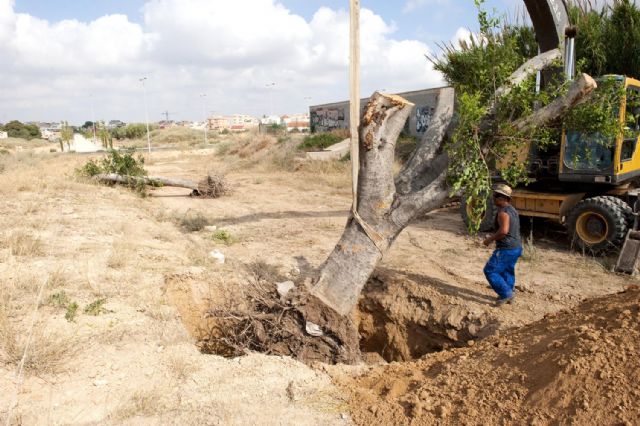 Los primeros ficus de la Avenida de América han llegado ya a su nueva ubicación en la Barriada Virgen de la Caridad, conocida como Las Seiscientas, y han sido transplantados concretamente en la prolongación de la vía verde de Barrio Peral.