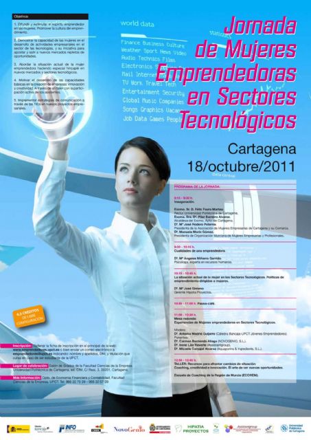 El próximo 18 de octubre de 9:00 a 13:45 horas tendrá lugar la Jornada sobre Mujeres Emprendedoras en Sectores Tecnológicos, que se celebrará en el Salón de Grados de la Facultad Ciencias de la Empresa de la Universidad Politécnica de Cartagena (edificio del antiguo CIM).
