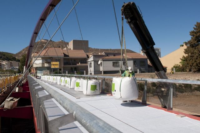 Los operarios que trabajan en la pasarela peatonal del puente del Barrio de la Concepción han realizado esta mañana una serie de pruebas de carga para comprobar la resistencia de la estructura y garantizar su seguridad.