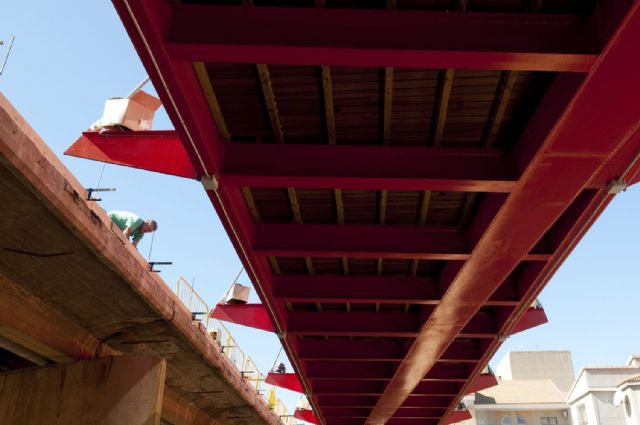 Aprovechando este corte total de tráfico, los operarios también han colocado las barandillas del puente y han terminado una de las aceras de la carretera que unirá la Avenida Pío XII hacia la calle Real.