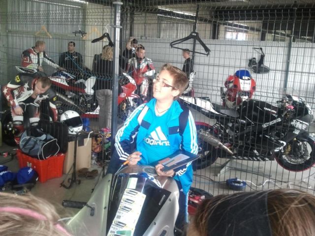 Luego han podido presenciar un entrenamiento de motociclismo, con equipos de campeonatos realizando sus pruebas. Los alumnos han disfrutado del entrenamiento y han visitado las distintas instalaciones de la torre control y han podido observar la totalidad del circuito desde lo mas alto de la torre. También han bajado a la zona de boxes para estar con los pilotos y ver de cerca las motos. Se han hecho fotografías con ellos y han recibido algunos autógrafos de recuerdo.