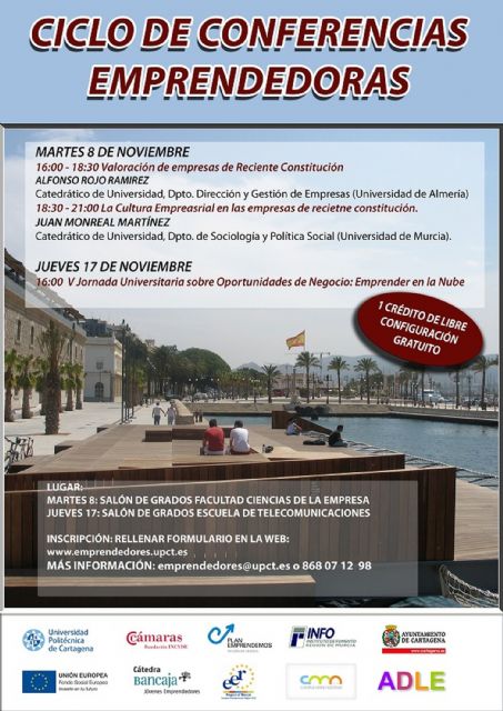 Más Información: Dpto. de Economía Financiera y Contabilidad, Facultad Ciencias de la Empresa, UPCT. Tel. 868 07 12 98 - 968 32 70 39. emprendedores@upct.es, www.emprendedores.upct.es, Agencia de Desarrollo Local y Empleo, Tel 968523451 adle@ayto-cartagena.es http://adle.cartagena.es/