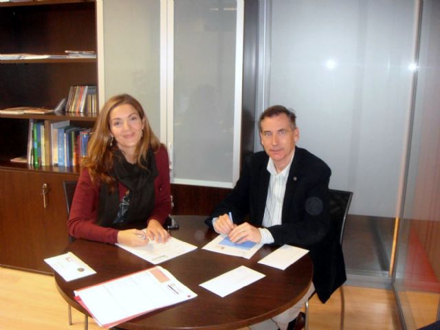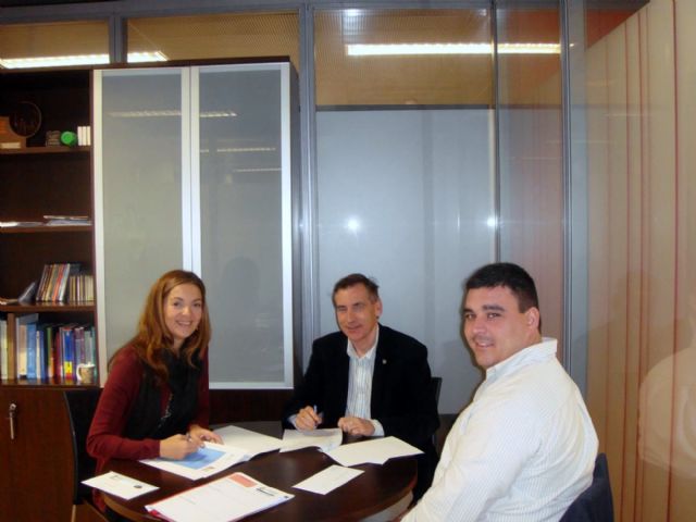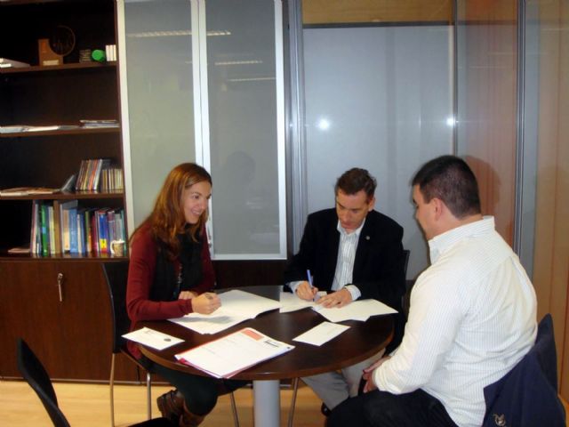 La concejala de Medio Ambiente del Ayuntamiento de Cartagena, Carolina Palazón, ha firmado esta mañana con el vicerrector de Estudiantes y Extensión Universitaria, Francisco Martínez, y el presidente del Consejo de Estudiantes, Martín Puentes, el convenio de colaboración para la instalación de un punto manual del servicio municipal de préstamo automático de bicicletas Bicity.