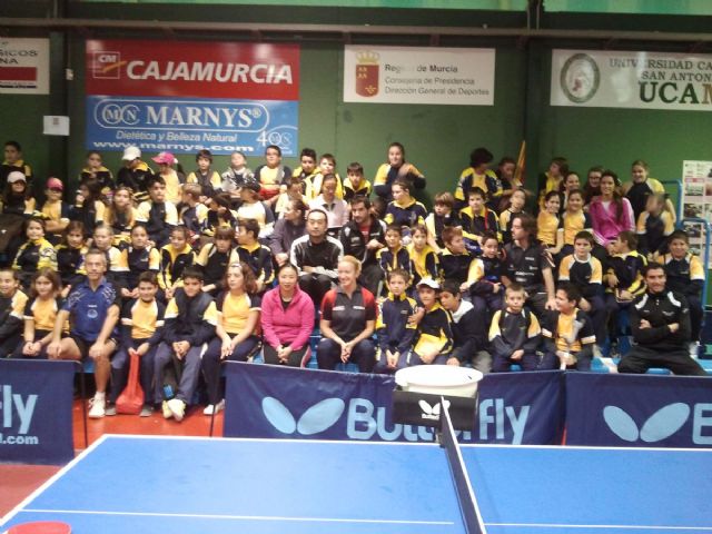 Deportistas de élite de los clubes UCAM Floymape y UCAM Cartagena compartieron la jornada del miércoles con más de 70 escolares en el pabellón municipal de tenis de mesa del Barrio Peral