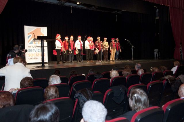 Ataviados con gorros de Papá Noel y con panderetas y zambombas, los jubilados han subido al escenario muy animados porque, como han gritado algunos desde las tablas, los mayores estamos más vivos que nunca.