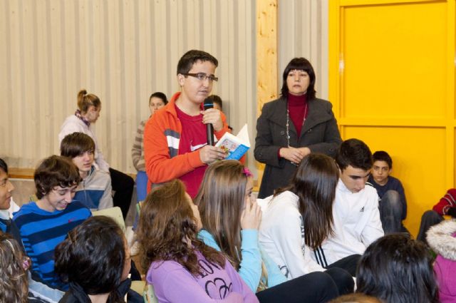 Antes del encuentro con el jurado de los Premios Mandarache y Hache, Begoña Oro estuvo en el IES Los Molinos donde charló del libro con los alumnos de Secundaria.